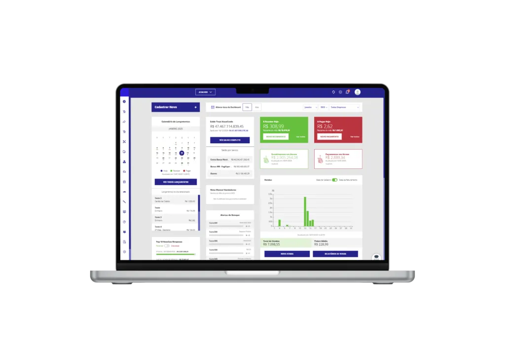 Gerencie suas contas de forma prática e eficiente com nosso ERP Online. Planeje suas finanças, controle receitas e despesas, e reduza os índices de inadimplência. Otimize o planejamento financeiro da sua empresa e tenha total controle do fluxo de caixa.